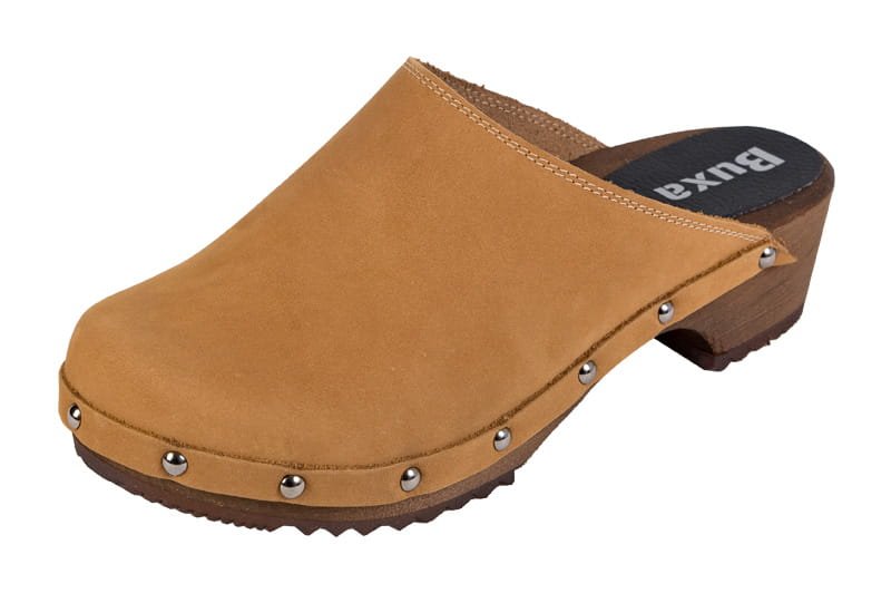 Pohodlné dřeváky jsou vyrobeny pro ženy z přírodní kůže a světlého lipového dřeva. Svršek je esteticky připevněn ozdobnými hřebíky. Podešev má konturovaný tvar, jemná podpora podélné klenby chodidla pomáhá korigovat ploché nohy, výřez pro patu stabilizuje správnou polohu paty, eliminuje sklon k deformaci paty. Dřevěná stélka se na rozdíl od kožené při používání nedeformuje, podporuje správné držení těla, tlumí otřesy způsobené chůzí, odlehčuje páteř a klouby, výborně saje pot a neodírá chodidla. Výška podpatku je 5 cm, výška podpatku je 3 cm.